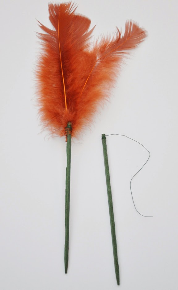 Hold them at the top of a florist's pic and wrap the fine wire around and around to create a feather pic.